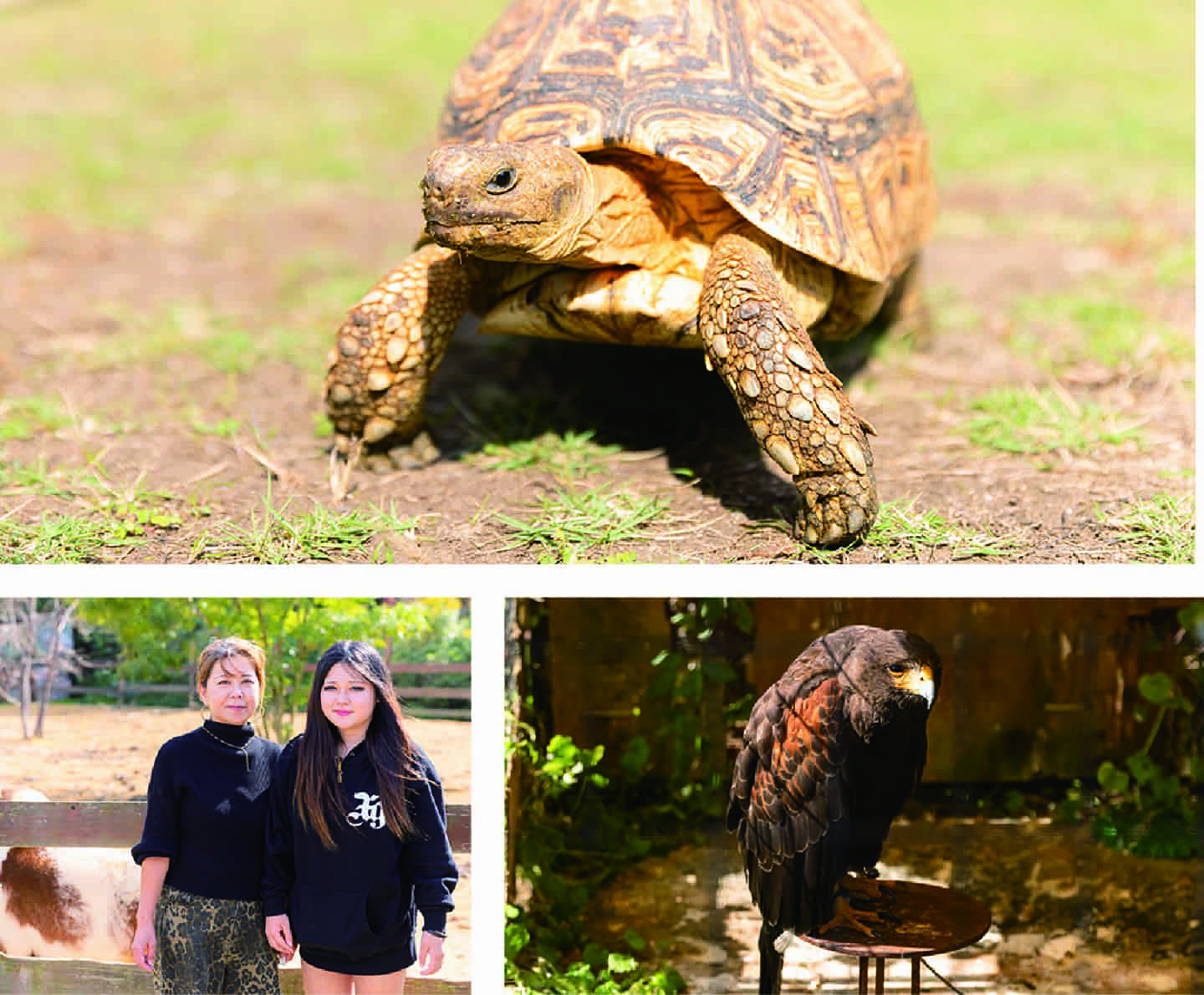 ケヅメリクガメやハリスホークなどの動物が待っている。エサ(100円)も販売中。石堂さん親子が仲良く営んでいる