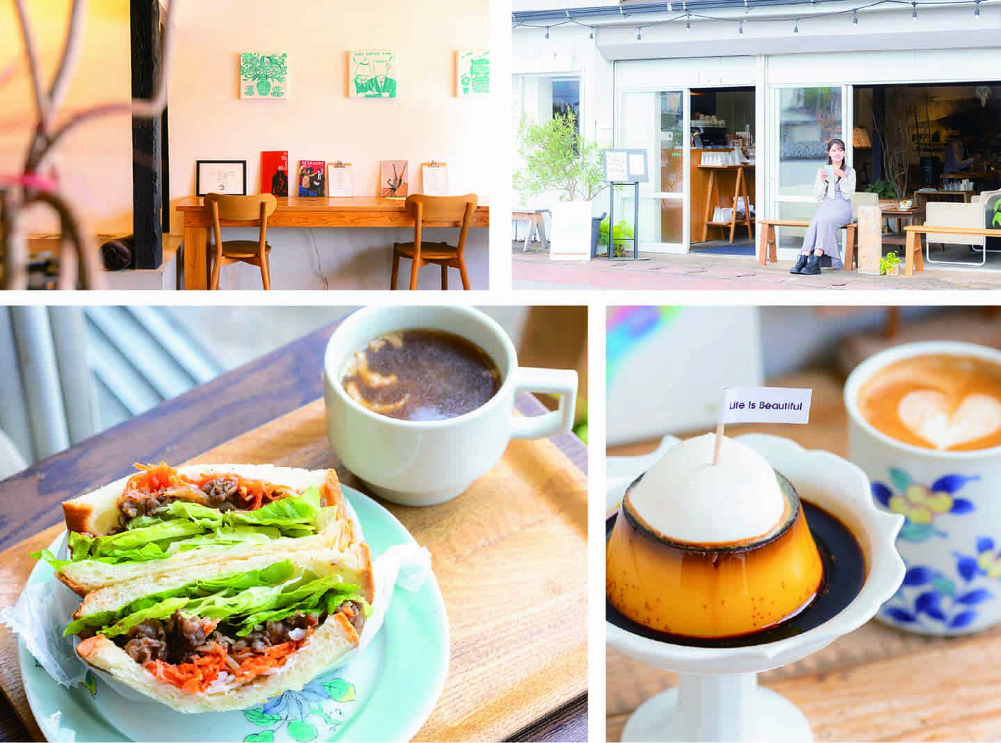 おしゃれな雰囲気が漂うが、気軽に立ち寄りやすいカフェ。『伊万里牛サンド』(1078円、ドリンクセット1518円)は、野菜もたっぷりで食べ応えあり。佐賀県産の卵と牛乳を使った人気の『さがぷりん』(600円、ドリンクセット1000円)