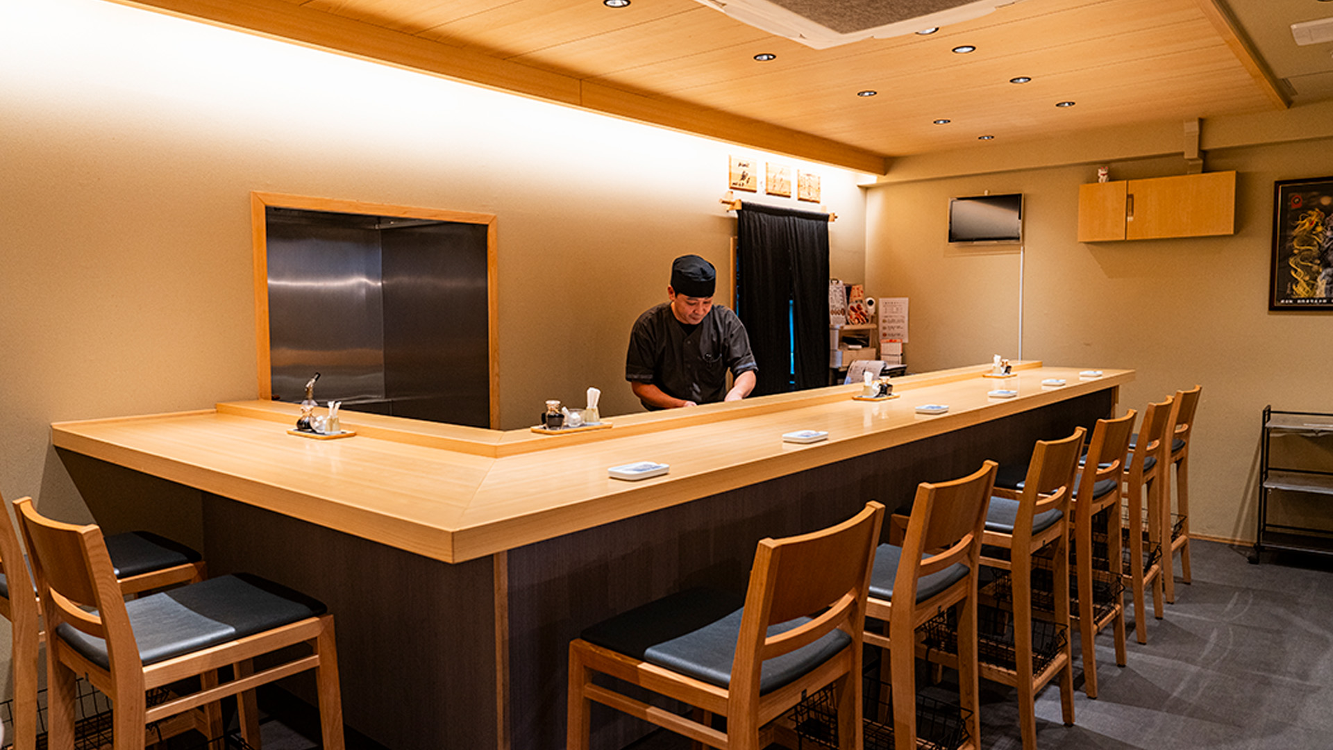 福岡の名店のひとつ、『たつみ寿司』で経験を積み、『鮨 寿楽』で花板を務める。2017年に『あき郎』を開き、2023年に現在の場所に移転。地域の人から愛されている町の寿司屋だ。